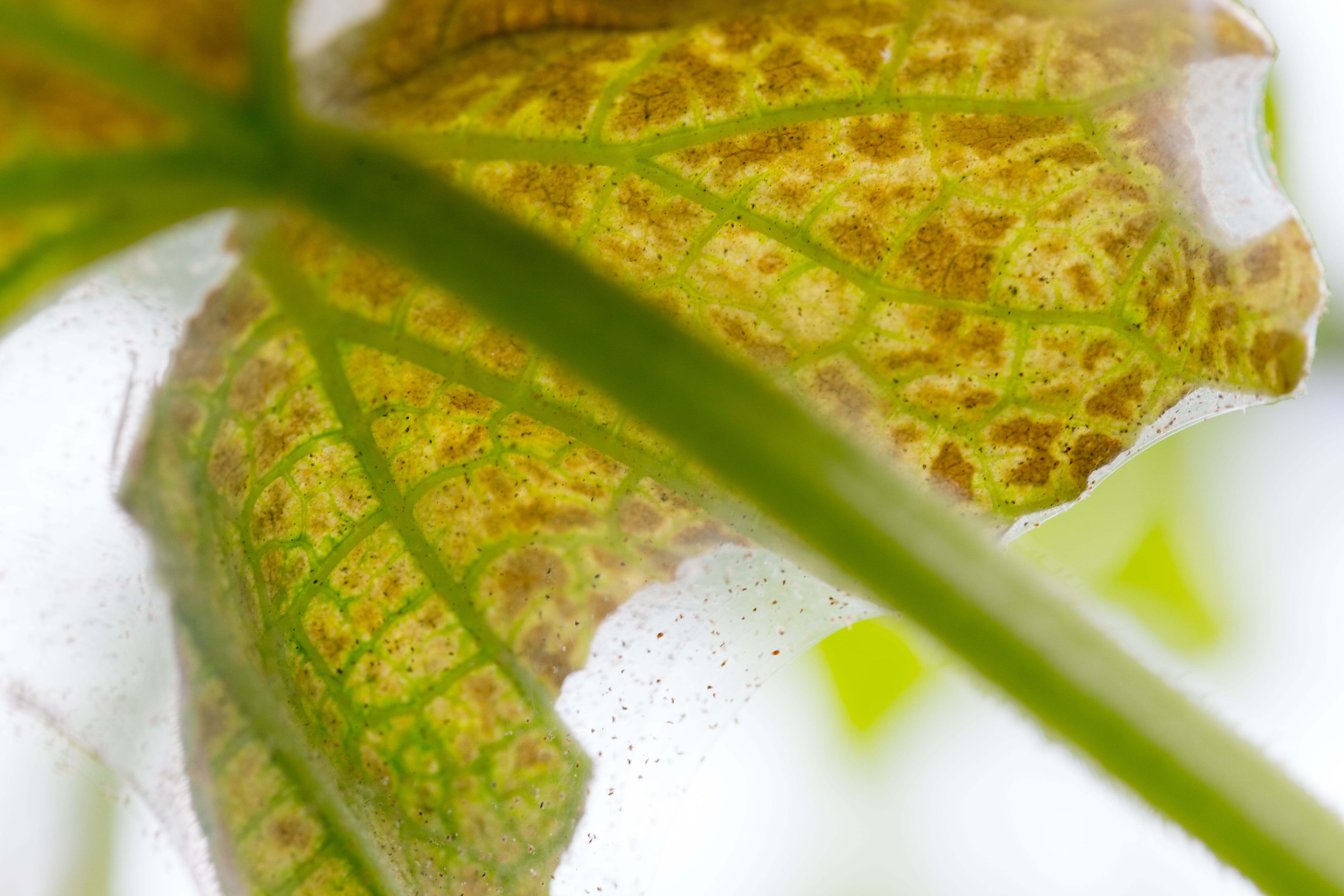 What their webbing looks like: fine, silky, and dense—like a sheer veil stretched across leaves and stems. Found mostly on the undersides of leaves, leaf nodes, and crevices. Appears as a protective encasement, not a trap.