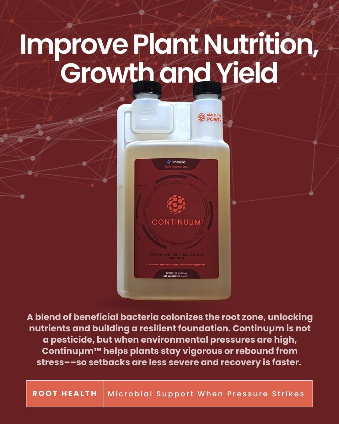 Continuµm™ → a co-cultured community of beneficial bacteria that set up around roots, unlock nutrients, and helps plants stay vigorous or rebound from environmental pressures.