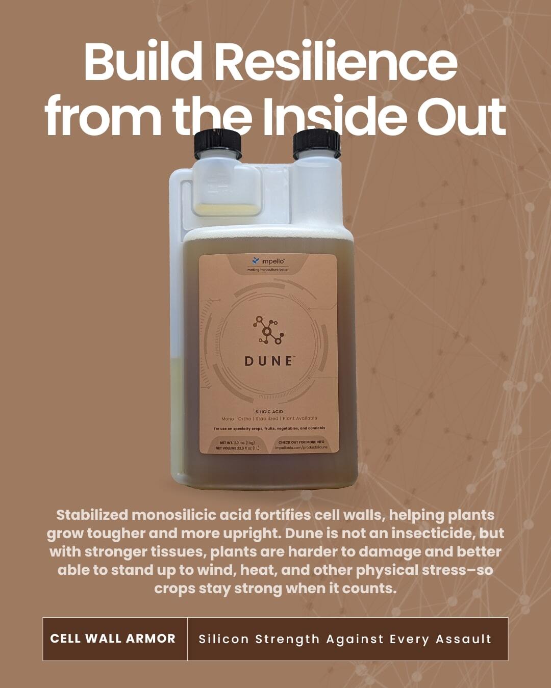 Dune™ → stabilized monosilicic (orthosilicic) acid—silicon in the form plants actually use—to reinforce cell walls and help plants stand taller and tougher.