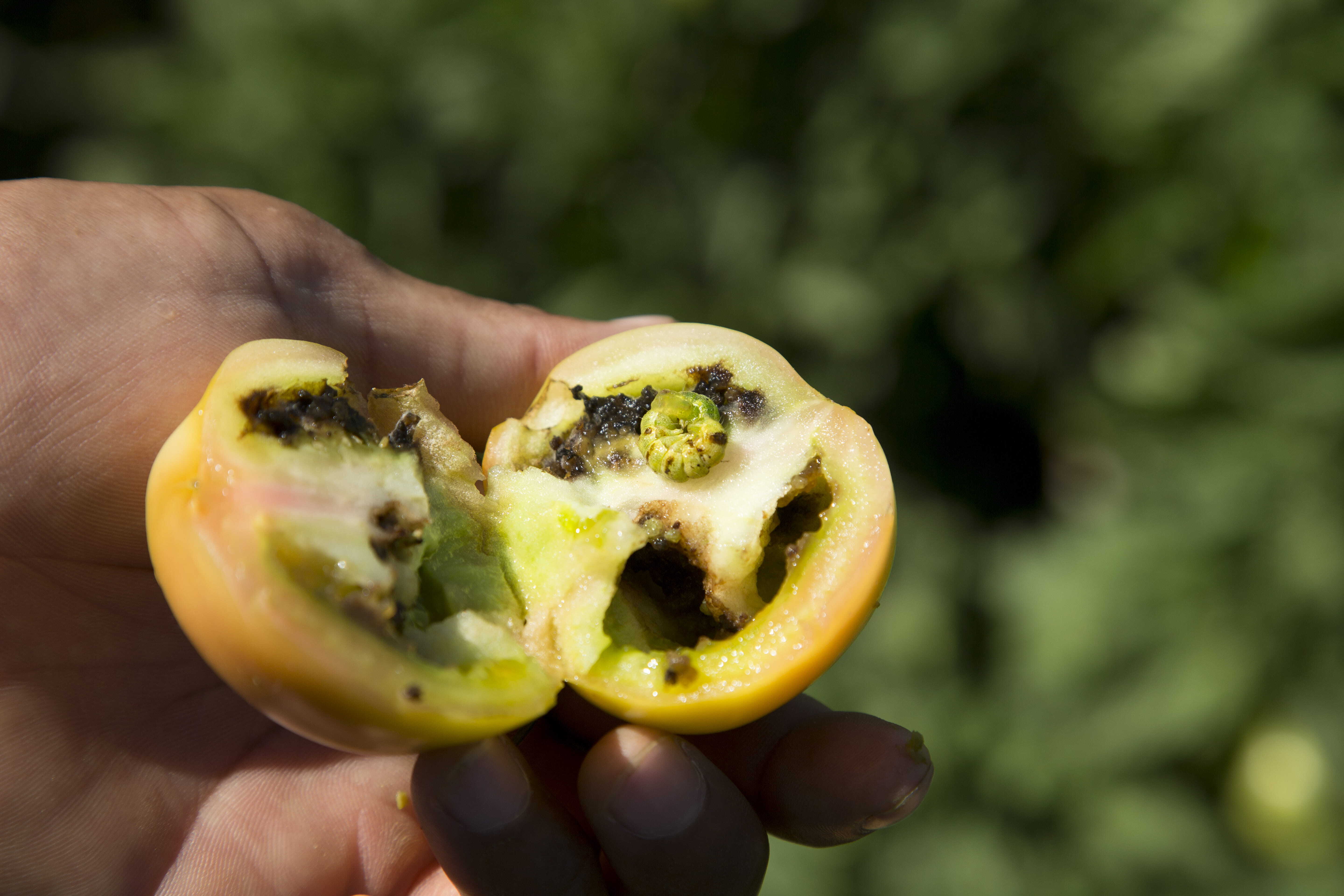 Tomato fruitworms damage plants by feeding on foliage and boring into developing fruit. Entry holes near the stem end of fruit, frass, and caterpillars feeding on plant tissue indicate active pest pressure.