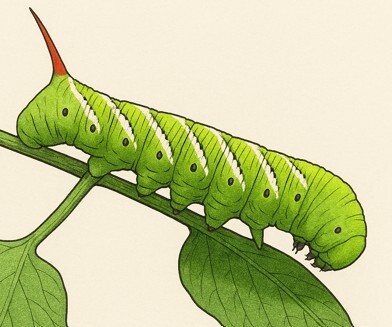Hornworms are large caterpillars that can remove significant foliage and damage fruit in a short period of time. Missing leaves and chewed fruit are common signs of pest pressure.
