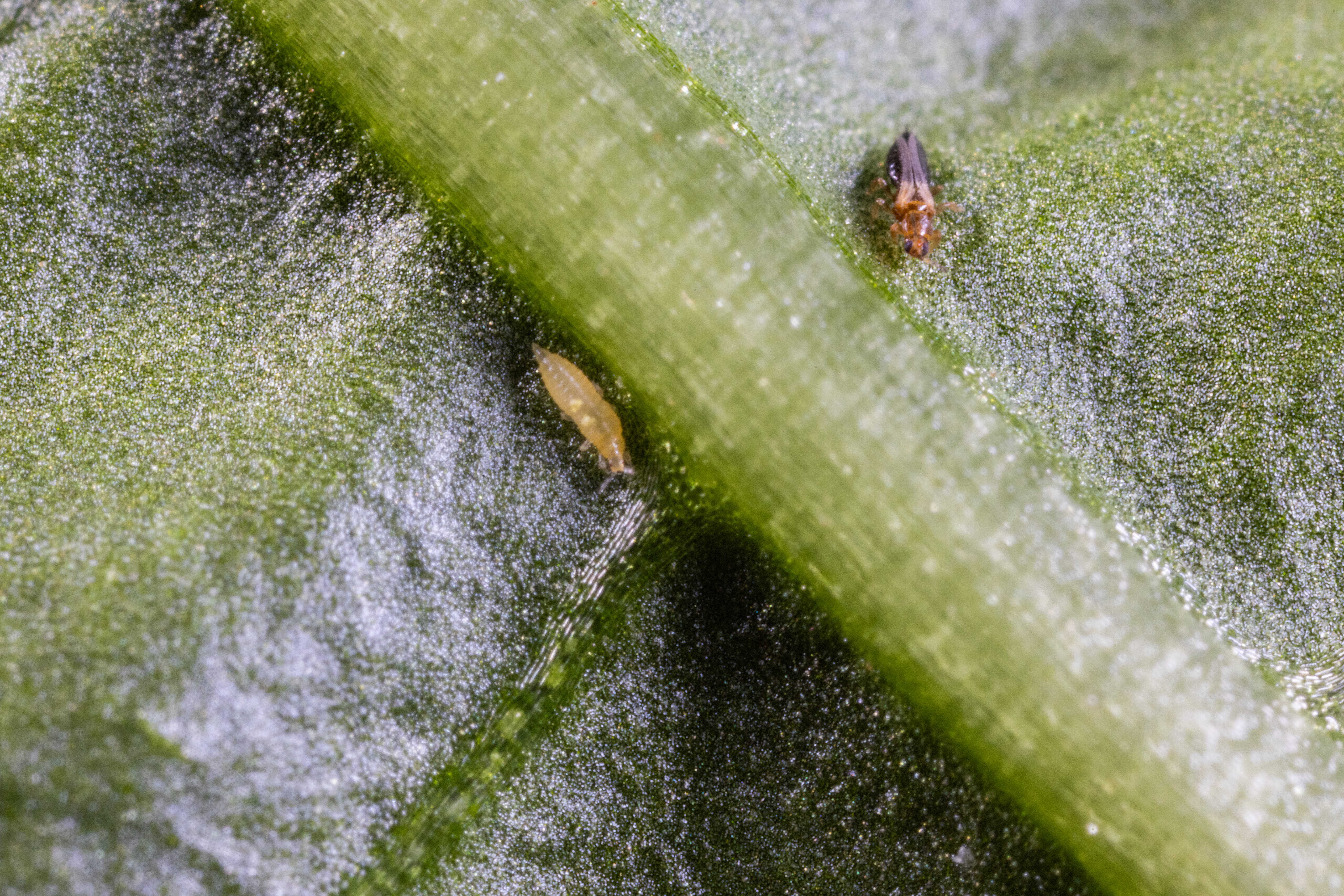 Thrips feed on plant tissue and can damage leaves, flowers, and developing fruit. Signs of thrips pressure include silvery streaking on leaves, distorted growth, and small insects found along leaf veins or within flowers.