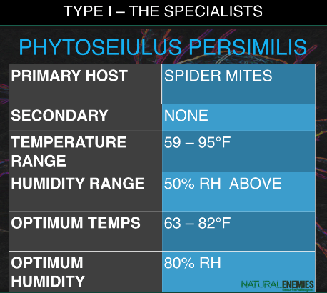 Other Tetranychus spp. (except Tetranychus evansi)Phytoseiulus persimilis is a specialist predator and does not feed on other mites, thrips, or pollen.